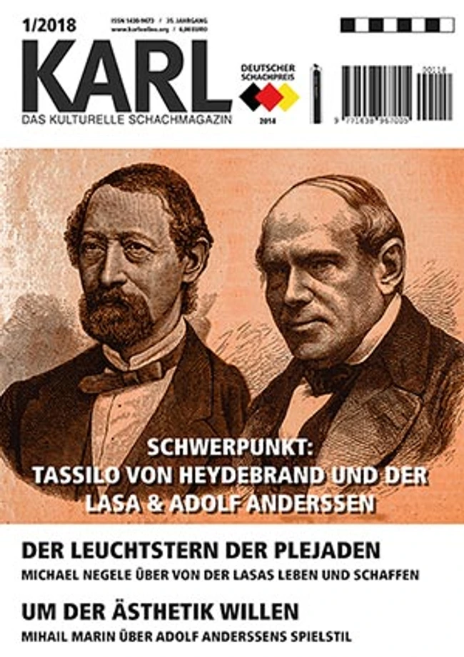 Dar am descoperit recent că germanii au o întreagă revistă lunară dedicată „fațetelor multiculturale” ale șahului. Se cheamă Karl – Das Kulturelle Schachmagazin și nu are doar partide comentate, diagrame de dezlegat și interviuri cu campioni, ci și o mulțime de alte articole care o fac atractivă și pentru cei ce nu știu și nu joacă șah nici măcar ca amatori. De exemplu, un număr din Karl dedicat olimpiadei de la Dresda, din 2008, al cărui sumar l-am văzut în engleză, conține articole precum „Propaganda pe 64 de pătrate. München 1936” sau „Timbre poștale cu olimpiade de șah”. În tot acest număr al revistei sînt doar opt partide, în schimb el e plin de fotografii istorice, de la olimpiade și nu numai. Cum spune editorul revistei, Harry Schaack: „Șahul a fost mereu mai mult decît un simplu joc. Este o lume cu multiple fețe, culturală, personală, psihologică, artistică, sportivă, socială, științifică și uneori umoristică. Karl este despre calitatea estetică a experienței lecturii, asigurînd un format atractiv, fotografii interesante și o prezentare de calitate.”