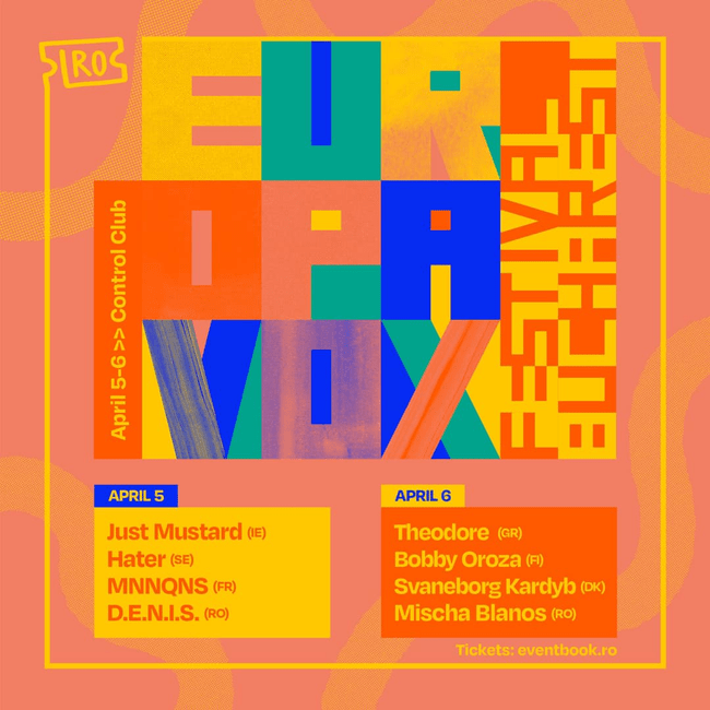 Artiști din șapte țări europene vor concerta la Control Club în perioada 5-6 aprilie, la cea de-a doua ediție Europavox Festival Bucharest. Just Mustard, una dintre cele mai promițătoare trupe rock din Irlanda, cvartetul indie pop Hater(Suedia), rockerii experimentali MNNQNS (Franța), multi-instrumentistul Theodore (Grecia), artistul soul Bobby Oroza(Finlanda) și apreciatul duo jazz Svaneborg Kardyb (Danemarca) vor cînta alături de artiștii locali Mischa Blanos și D.E.N.I.S. în cele două zile de festival. Program și informații pe europavox.com, institutfrancais.ro și control-club.ro.