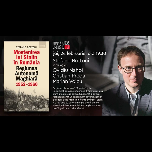 Editura Humanitas vă invită joi, 24 februarie, ora 19:30, la o dezbatere live online cu istoricul Stefano Bottoni, conferențiar la Universitatea din Florența, Ovidiu Nahoi, redactor-șef al Radio France Internationale România, Cristian Preda, profesor de științe politice la Universitatea din București, și Marian Voicu, jurnalist și producător TVR, despre volumul Moștenirea lui Stalin în România. Regiunea Autonomă Maghiară, 1952–1960 apărut la Humanitas, în colecția Istorie, în traducerea lui Mugur Butuza.