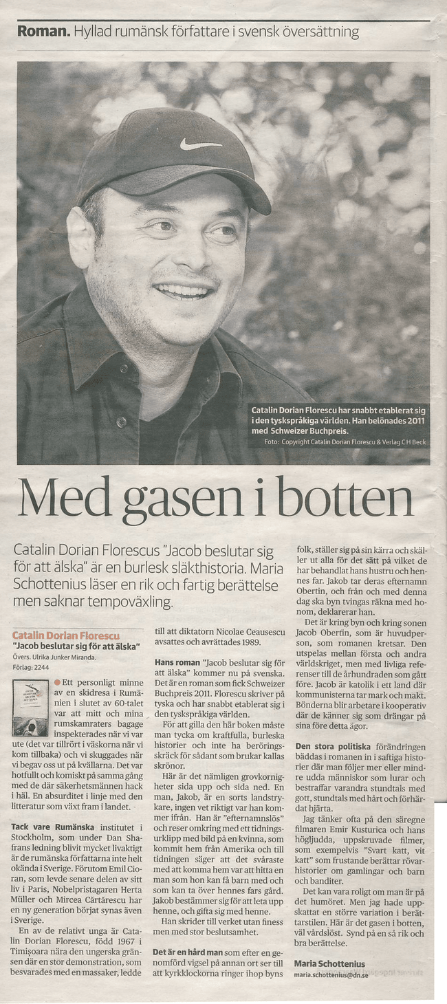 Principalul cotidian suedez, Dagens Nyheter, publică în ediţia sa din 9 februarie un articol care face referire la rolul jucat de ICR Stockholm în promovarea literaturii române în Suedia: „Datorită Institutului Cultural Român de la Stockholm, un institut foarte activ sub conducerea lui Dan Shafran, scriitorii români nu sînt cu totul necunoscuţi în Suedia. Pe lîngă Emil Cioran, Herta Müller şi Mircea Cărtărescu, o nouă generaţie de scriitori a început să-şi facă simţită prezenţa.“ Afirmaţia este făcută de reputatul critic literar Maria Schottenius, cu ocazia recenziei la romanul Jacob se pregăteşte să iubească de Cătălin Dorian Florescu, apărut în aceste zile în limba suedeză, la editura 2244.